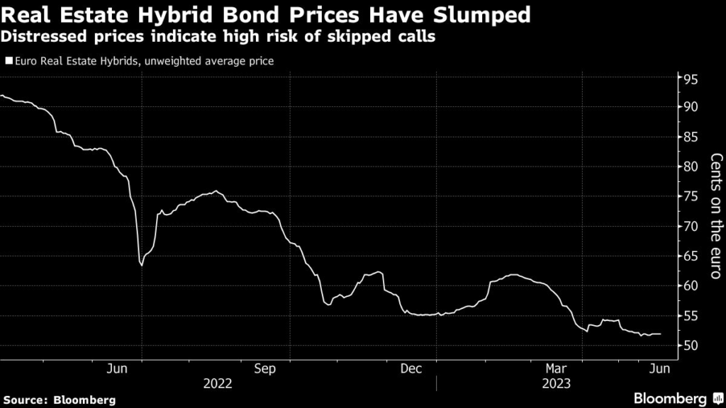 The average price of euro-denominated hybrid bonds issued by real estate companies stands at just over half of face value, around a record low, based on data compiled by Bloomberg.