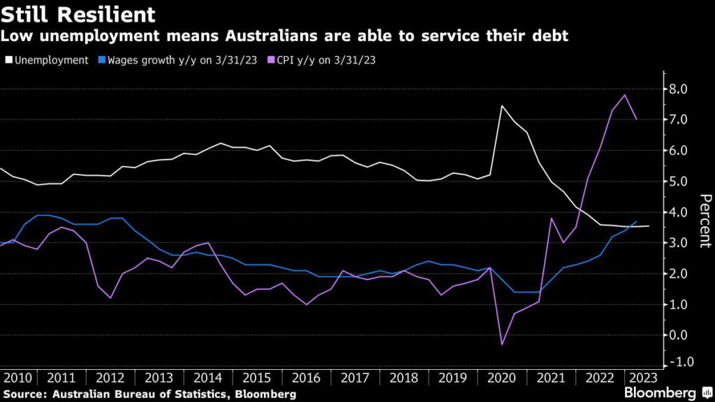 The comments highlight the resilience of Australia’s economy to 4 percentage points of rate hikes in just over a year, with loan arrears still contained and unemployment holding at a very low level of 3.6%.