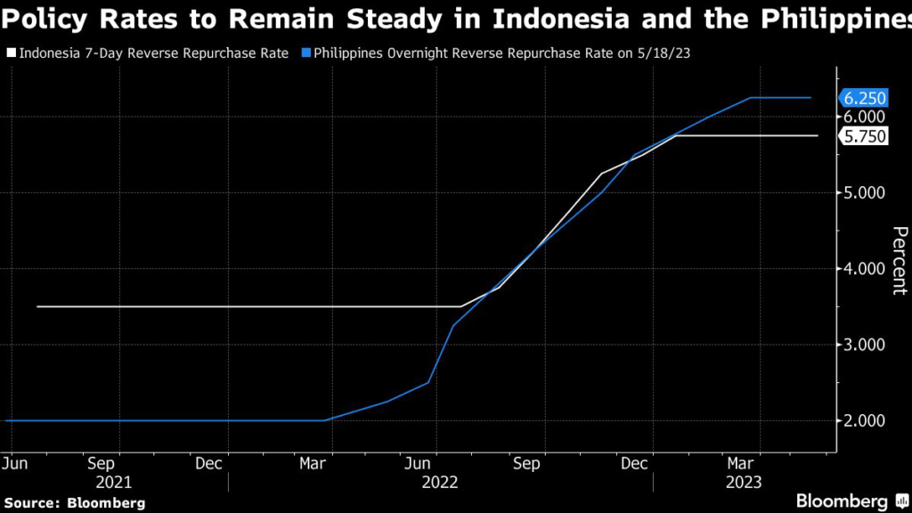 (Bloomberg) — Indonesia and the Philippines are expected to leave their key interest rates unchanged Thursday and sustain the pause through 2023, amid easing price pressures.