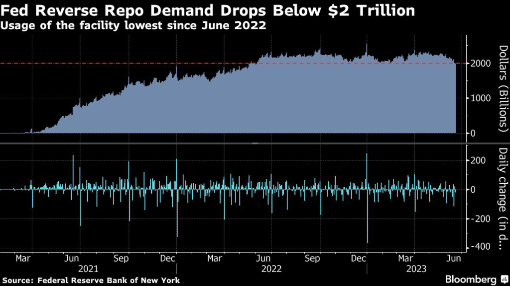 The amount of money parked at the Fed’s overnight reverse repurchase agreement facility has dropped below $2 trillion for the first time in more than a year.