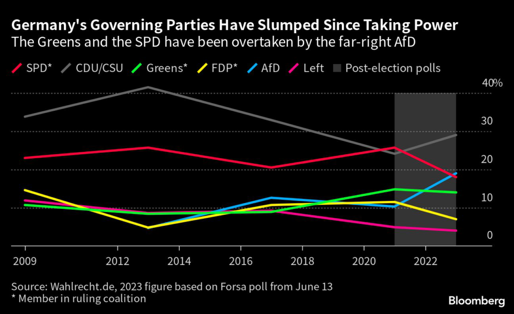 The party leapfrogged Scholz’s Social Democrats this month to rank as Germany’s no. 2 party in a Forsa poll for broadcaster RTL for the first time.