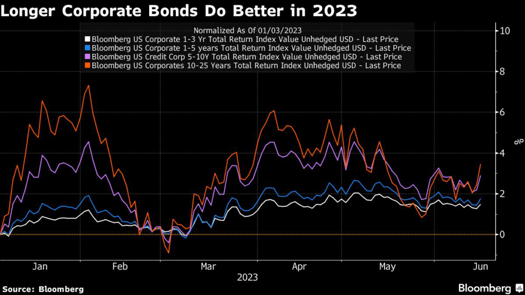 The stronger appetite for safer, longer debt offers the credit market’s perspective amid an ongoing debate over the Fed’s policy outlook after its latest pause on rate hikes.