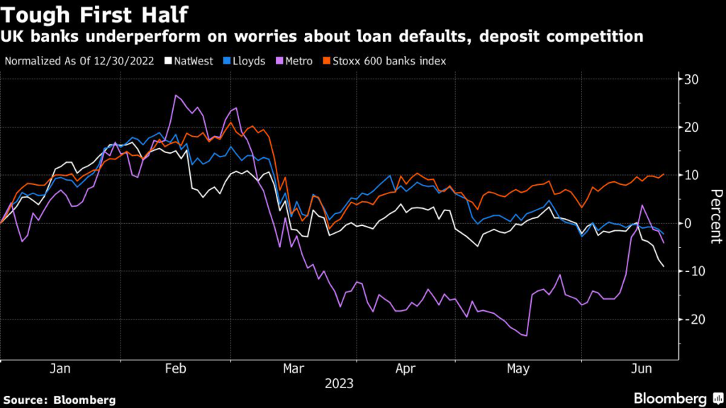 UK bank stocks have mostly fallen this year as lenders are expected to compete for deposits by offering savers higher rates of interest, while loan losses are forecast to mount as some consumers and businesses struggle to pay higher debt servicing costs.