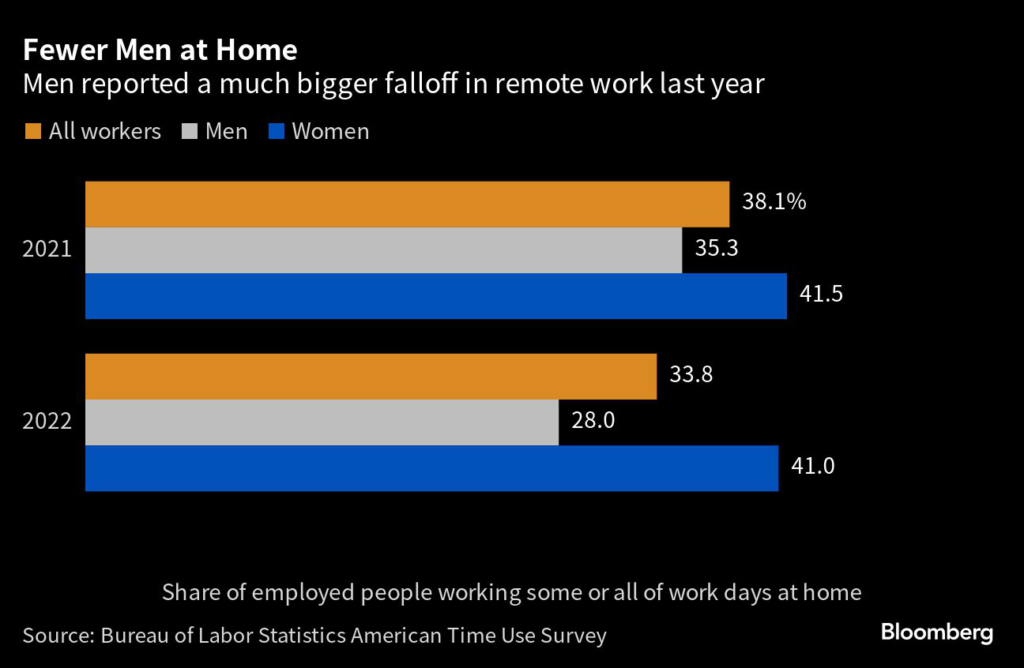 The share of men who worked at least partly at home on an average day dropped to 28% in 2022 from about 35% the year before, results of an annual survey published Thursday by the Bureau of Labor Statistics showed.