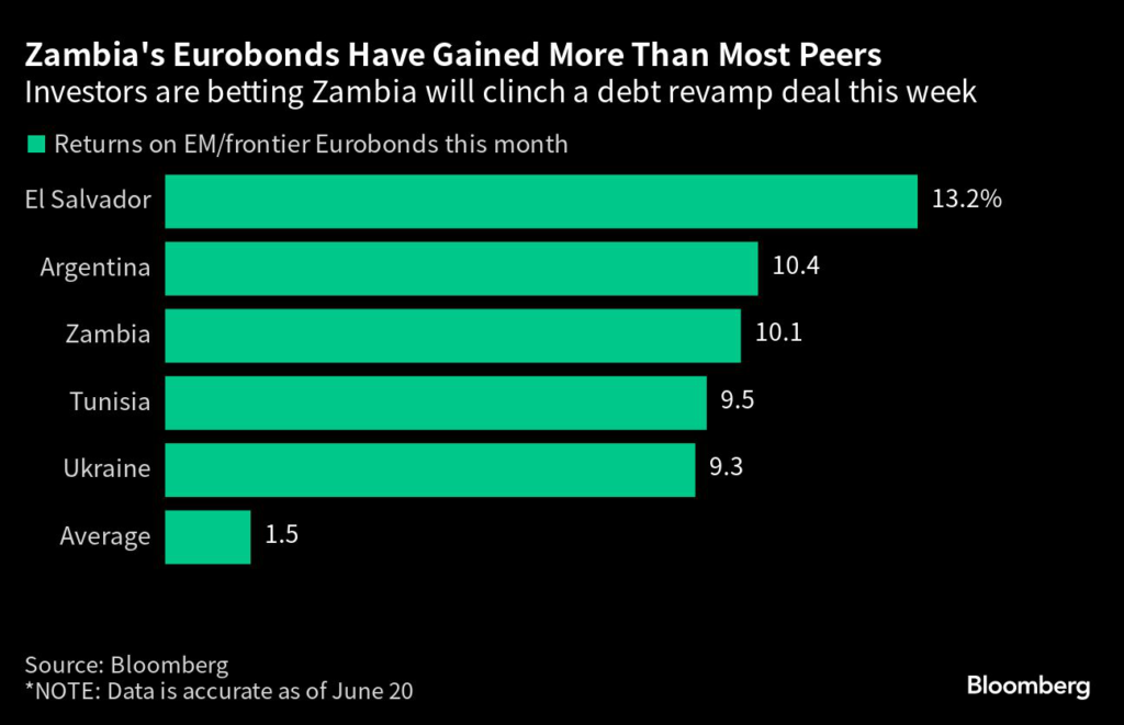 Zambia’s currency and dollar bonds traded near multi-month highs, having chalked up double-digit gains so far this month on expectation that the nation is about to clinch a debt restructuring deal with official creditors, possibly as soon as Thursday.