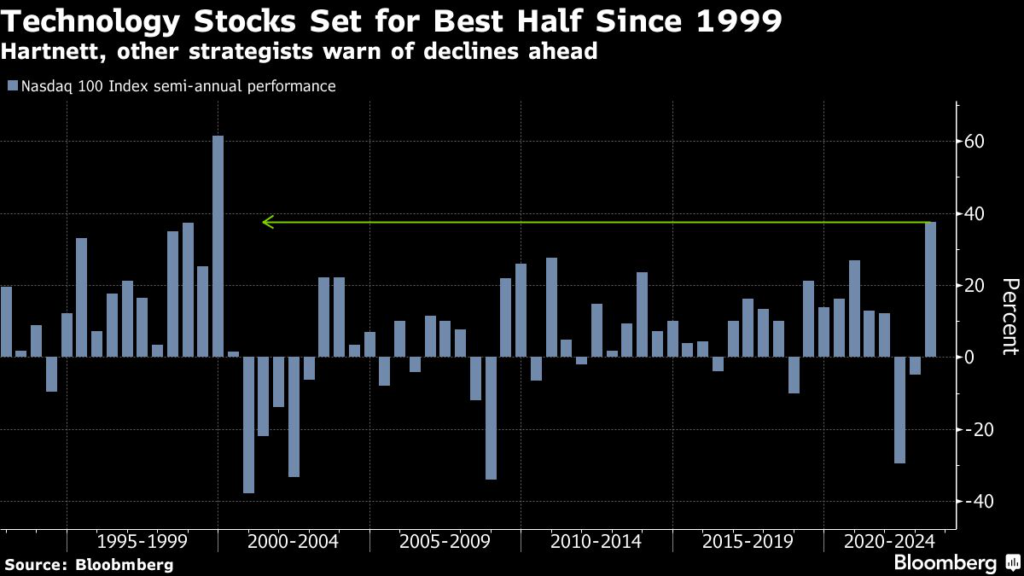 Investors exited with the Nasdaq 100 Index up 38% for the year and poised for its best half since the last six months of 1999, when it surged 61% after climbing in 26% in the first half.