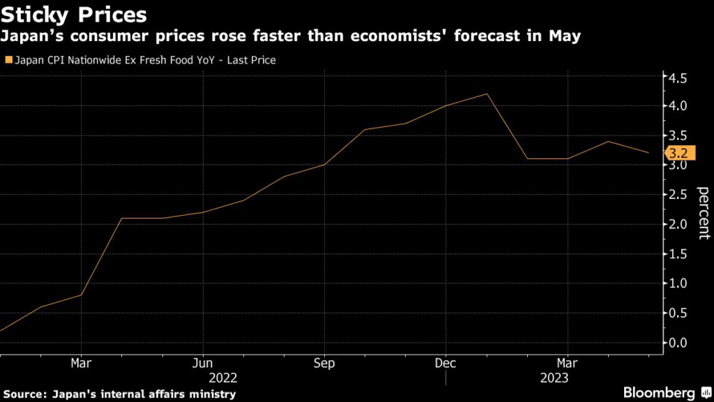 (Bloomberg) — Japan’s consumer prices rose at a faster pace than expected in May while the deeper inflation trend continued to strengthen, outcomes that could fuel speculation the central bank will raise its inflation forecasts in July and even tweak its stimulus program.