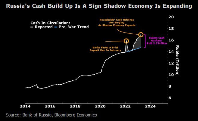The volume of rubles is a stark example of the distortions caused by the war that’s now in its 16th month.