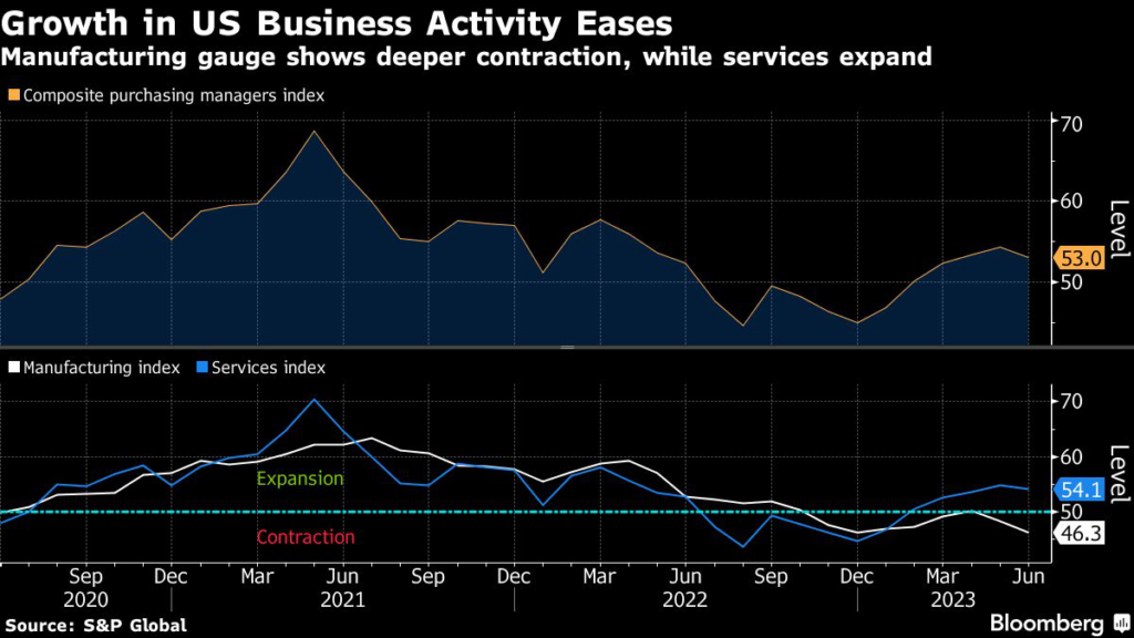(Bloomberg) — US business activity expanded in early June at the slowest pace in three months, held back by a deeper contraction at factories.