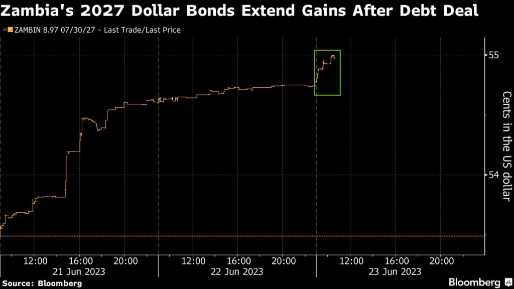 (Bloomberg) — Bonds of developing nations in debt distress gained on Friday in a broad relief rally sparked by Zambia’s precedent-setting deal with bilateral creditors.