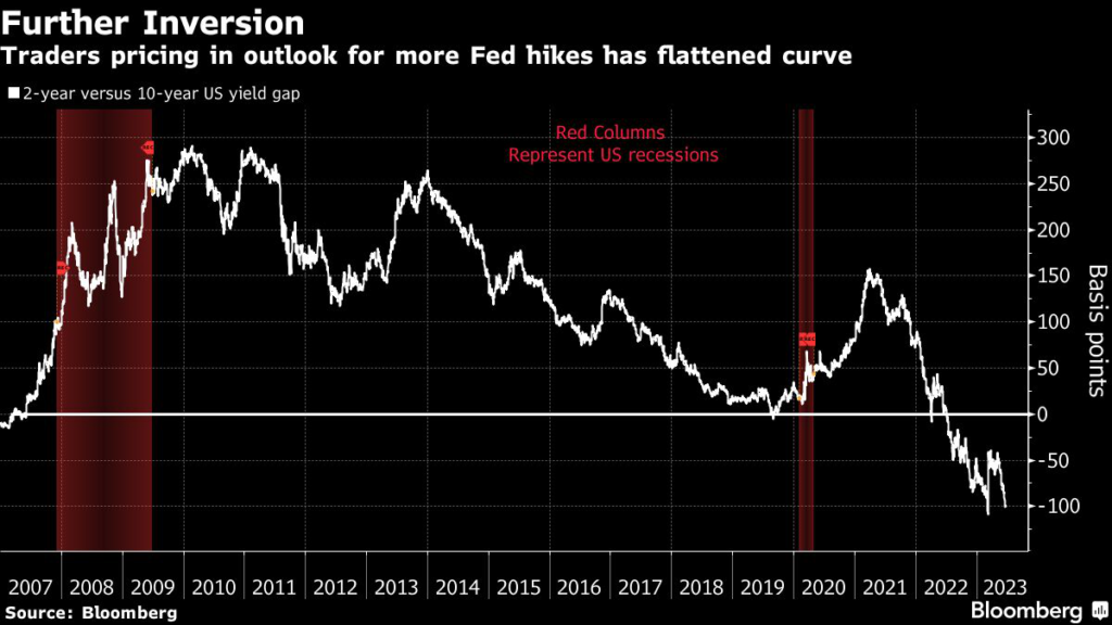 After Powell told US lawmakers this week that more rate hikes are likely, 10-year yields slipped to a full percentage point below 2-year rates, deepening a yield curve inversion that’s usually seen as a harbinger of a recession.