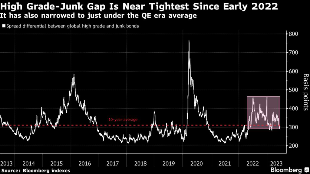 - High-yield companies lined up to fund at the fastest pace in five months after risk premia dropped to the lowest since credit markets were roiled by the regional banking crisis in March.