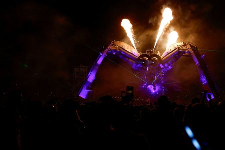 GLASTONBURY, England (Reuters) -A giant spider breathes fire into the cloudy night sky over Glastonbury’s Arcadia stage as thumping beats from electronic music duo the Chemical Brothers excite hundreds of fans.