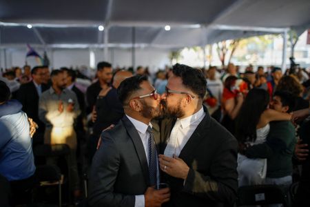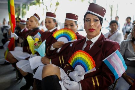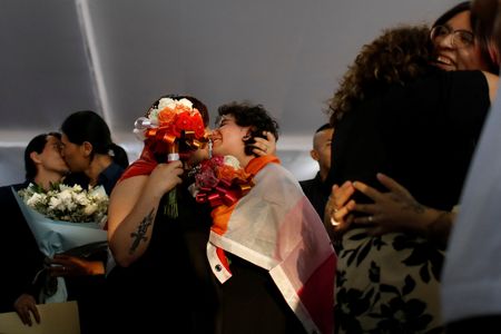 MEXICO CITY (Reuters) – Hundreds of same-sex couples and transgender people in Mexico City celebrated weddings and the completion of administrative processes to change their gender on Friday, in a mass ceremony a day before the city’s annual gay pride march.
