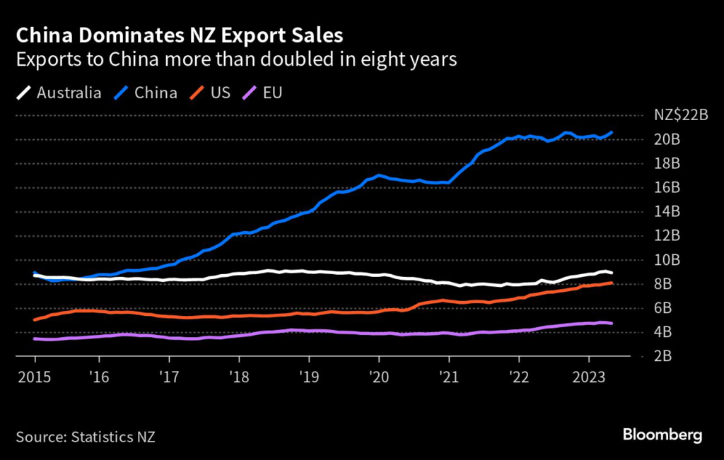 It overtook Australia as New Zealand’s biggest trading partner in late 2013, when both nations had about a 19% share of goods exports. Since then, Australia’s slice has dwindled to 12%.