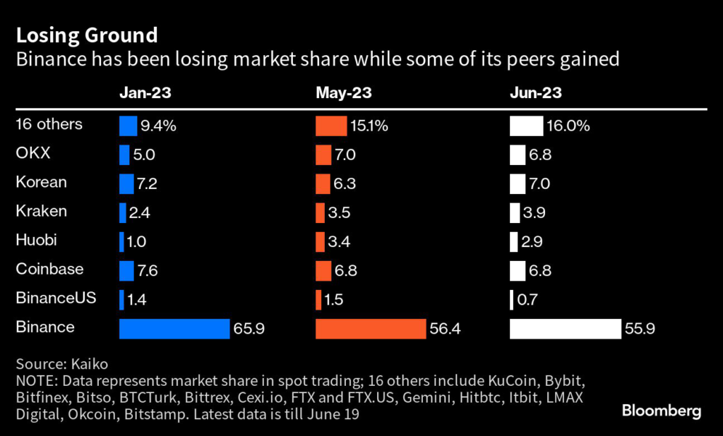 That’s the lowest since August, when it fell to 53.7%, Kaiko said. The world’s largest cryptocurrency exchange suffered a blow after the US Securities and Exchange Commission filed a lawsuit against the firm and its founder Changpeng Zhao on June 5.