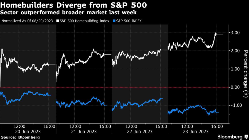 Both indexes slipped about 0.5% on Monday as traders weighed the Federal Reserve’s next move on interest rates this year. The housing supply shortage is lifting homebuilders, despite a strong May housing starts print that led investors to wonder if the market is in the early stages of overbuilding, Citigroup said in a note on Monday.