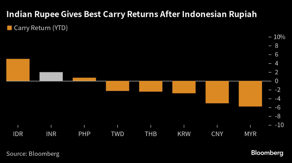 While the Indian rupee has been the second best to the rupiah in terms of carry returns so far in 2023, that looks set to change in second half of the year as investors including Amundi SA and HSBC Holdings Plc see the former as the standout choice.
