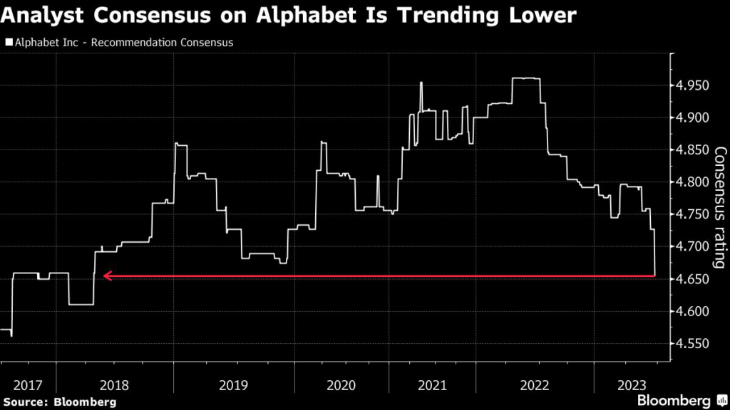 The downgrade brings Alphabet’s consensus rating — a proxy for its ratio of buy, hold, and sell ratings — to 4.655 out of five, the lowest for the stock since April 2018.
