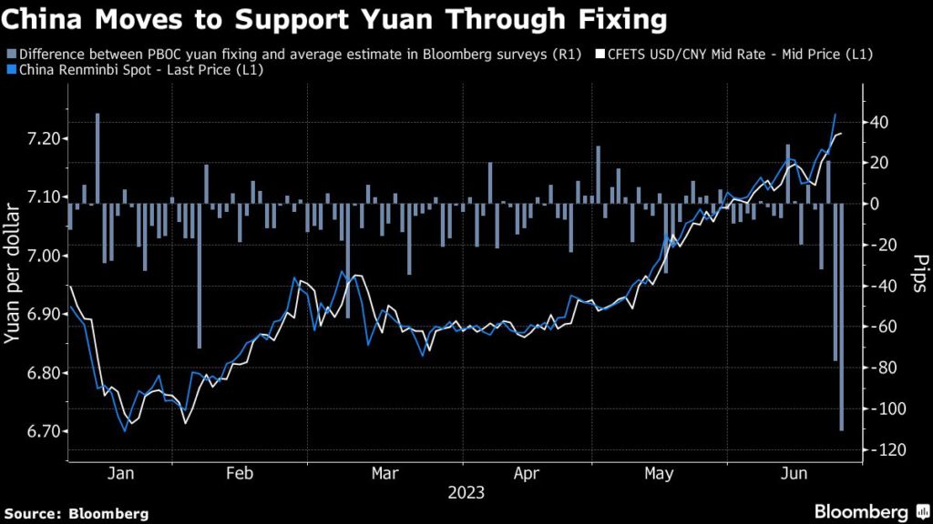 The so-called fixing — long seen as a policy signal on the Chinese exchange rate — was set 111 pips stronger than the average estimate in a Bloomberg survey — the largest premium since November.