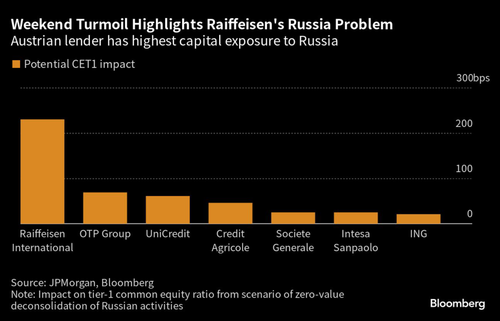 Raiffeisen, with more than €20 billion, is by far the most exposed, with management projecting as much as a 230-bp hit to CET1 should it fully write down its Russia unit. That compares with guidance of 40 bps at UniCredit and 70 bps at OTP.