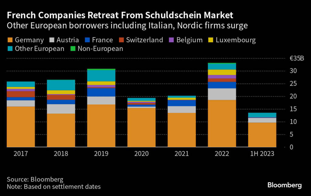 Issuance of corporate Schuldschein, a debt that mirrors both loan and bond structures, fell roughly 11% to about €13.5 billion in the first six months of the year, while the number of issuers dropped to 63 from 77 during the same period last year, according to Bloomberg data.