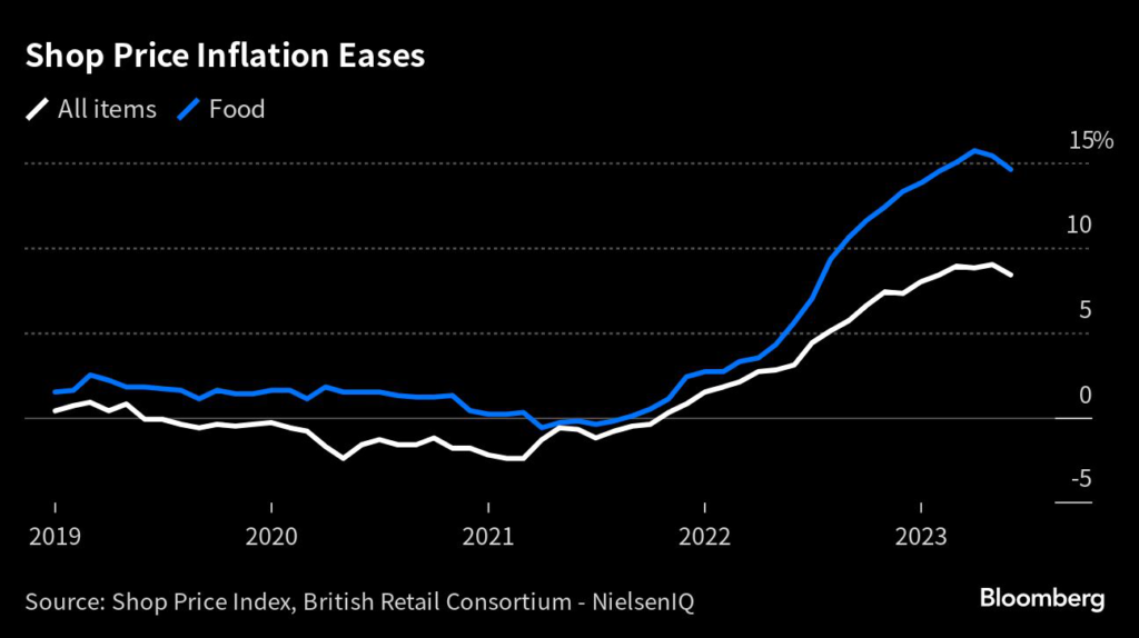 (Bloomberg) — Inflation in UK shops dipped this month, offering a glimmer of hope to ministers and central bankers struggling to contain the country’s cost-of-living crisis.