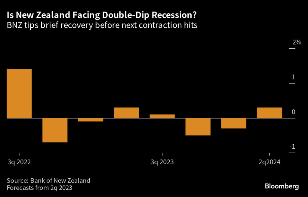 ANZ Bank New Zealand sees another recession starting in the third quarter. Output is being buffeted by sharply higher home-loan interest rates that have hit consumer spending as the central bank tries to tame inflation.