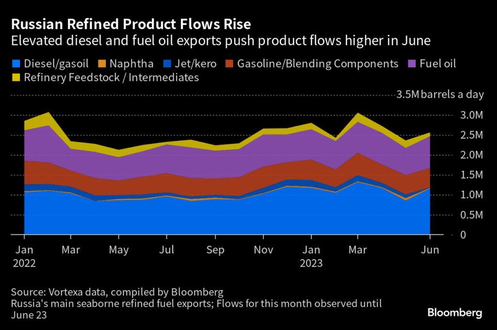 Shipments of diesel and gasoil, which account for about 40% of Russia’s oil product flows, jumped to 1.15 million barrels a day in the observed data.