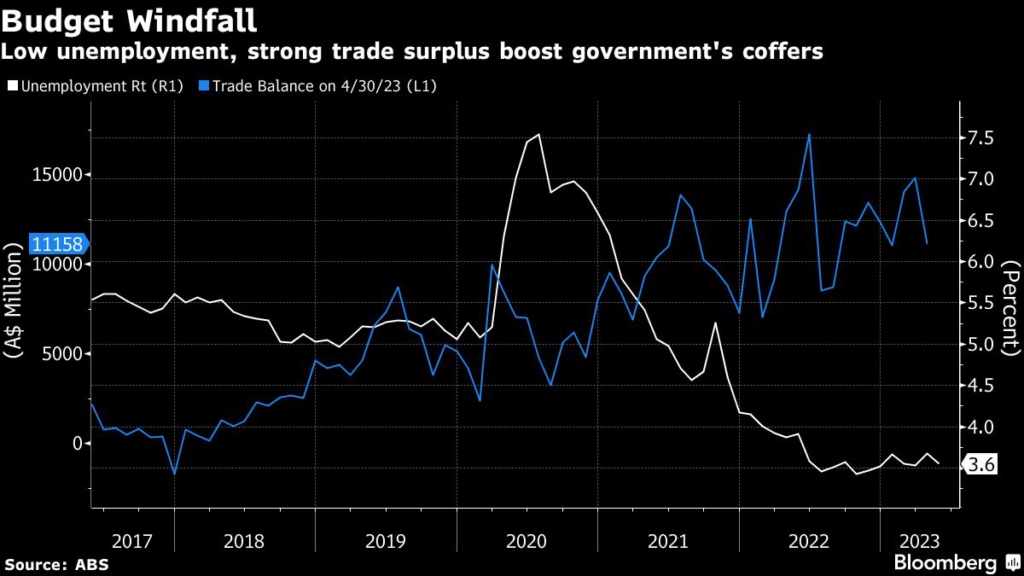(Bloomberg) — Australia’s first budget surplus in 15 years will be larger than the A$4.2 billion ($2.8 billion) forecast just last month, Treasurer Jim Chalmers said, as elevated commodity prices and a tight labor market bolster revenue.