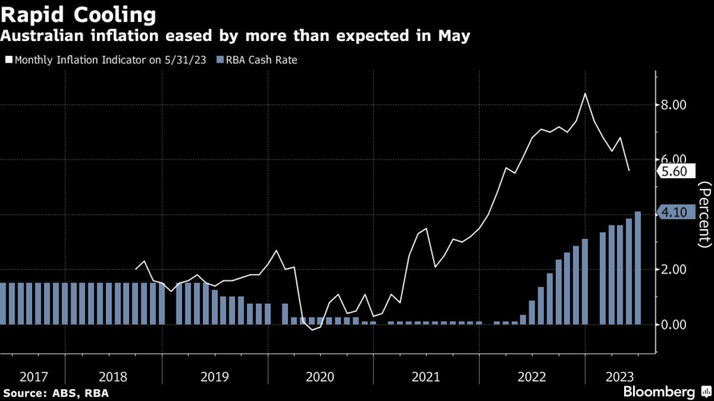 Australia’s inflation slowed more than expected in May, bolstering the case for the Reserve Bank to pause its 14-month tightening cycle at next week’s policy meeting and sending the currency lower.