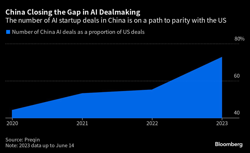 The number of Chinese venture deals in AI comprised more than two-thirds of the US total of about 447 in the year to mid-June, versus about 50% over the previous two years. China-based AI venture deals also outpaced consumer tech in 2022 and early 2023, according to Preqin.