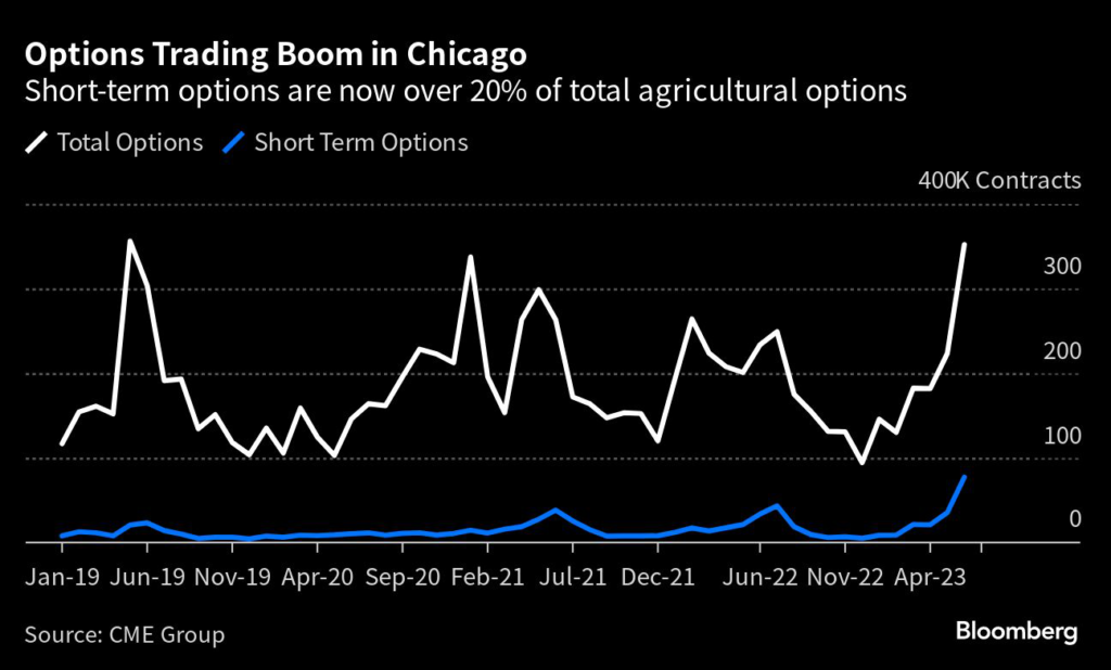 While these instruments are fairly new in agriculture, they have already taken off in markets like the S&P 500. Options that track the index and expire in seven days or less reached record volumes in 2022.