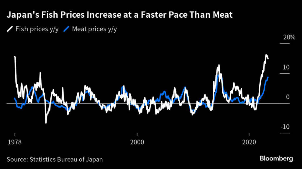 The nation’s food inflation surged to a 47-year high in May, with the price of fish increasing by 14.8% compared to the year before, while gains in meat price tags remained at a more modest 8.6%, according to data released by the Statistics Bureau of Japan.