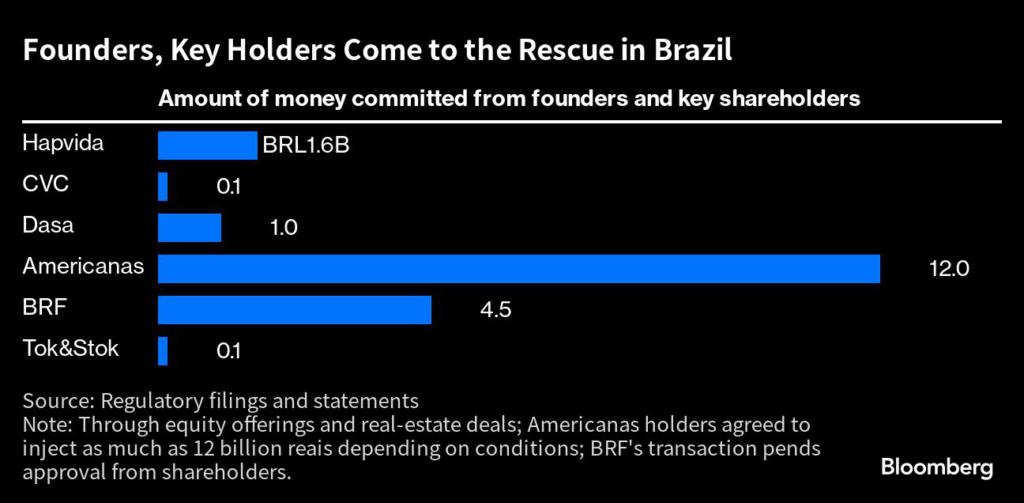 Founders and key shareholders in Brazilian firms have committed to injecting as much as 19.3 billion reais ($4 billion) in capital to aid them so far this year, according to data compiled by Bloomberg.