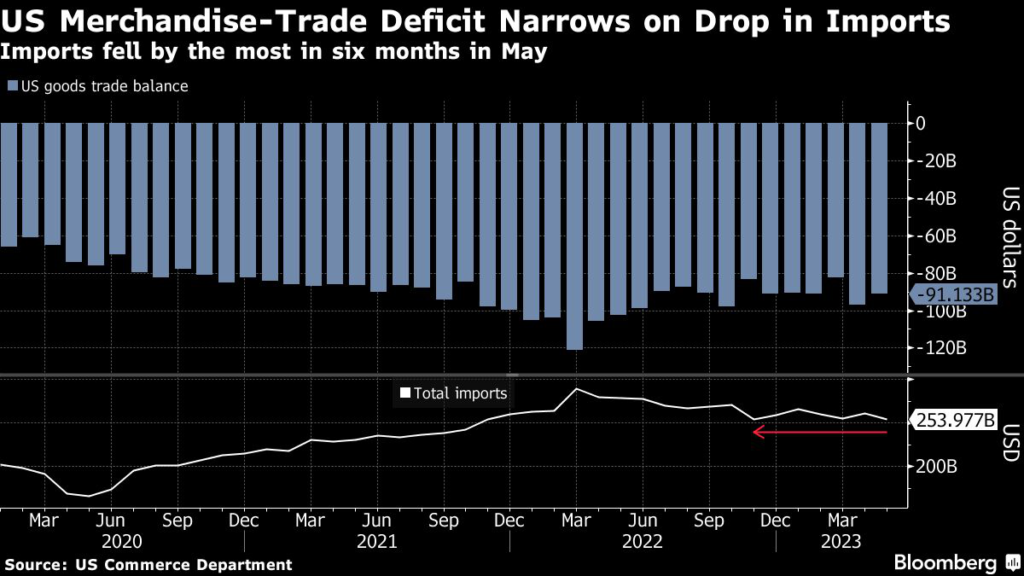 (Bloomberg) — The US merchandise-trade deficit shrank in May by more than expected as the value of imports slid by the most in six months.