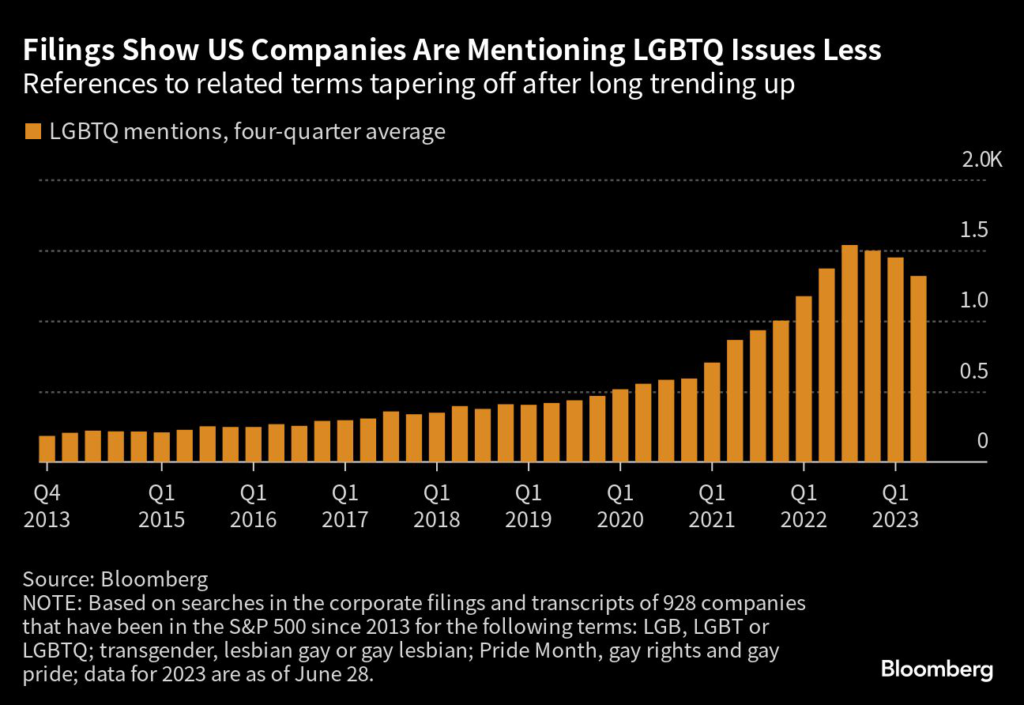References to “Pride Month” in filings, presentations and transcripts from April to June at more than 900 of the largest US companies dropped almost 40% from this time last year, the first decline in five years. Other LGBTQ terms showed similar declines, the analysis found.