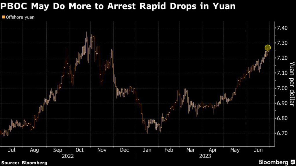 On a trade-weighted basis, the yuan is set to decline for a fourth straight month versus a basket of trading partners’ currencies, matching the stretch seen in late 2022 when the PBOC deployed various tools to slow depreciation.