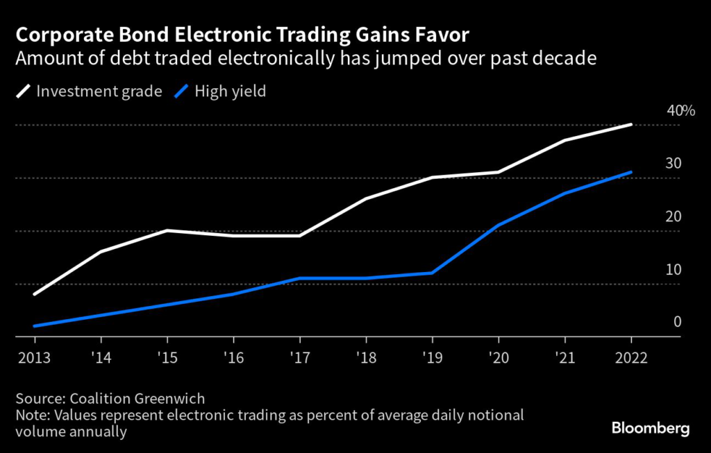 Now around 40% of investment-grade bond trading is done electronically compared to only 8% in 2013, according to consultancy Coalition Greenwich.