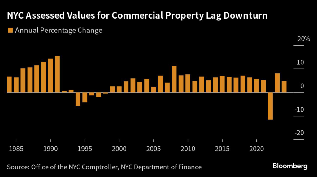 (Bloomberg) — New York City’s property tax system helps explain why a “doomsday” scenario for the Manhattan office market would only result in a modest shortfall in real estate tax revenue — at least in the near term.