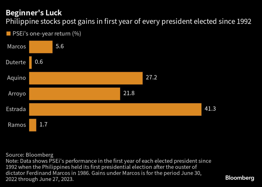 Philippine President Ferdinand Marcos Jr.’s market-friendly policies helped boost local shares in his first year in office, leading to gains of more than 5% since June 2022.