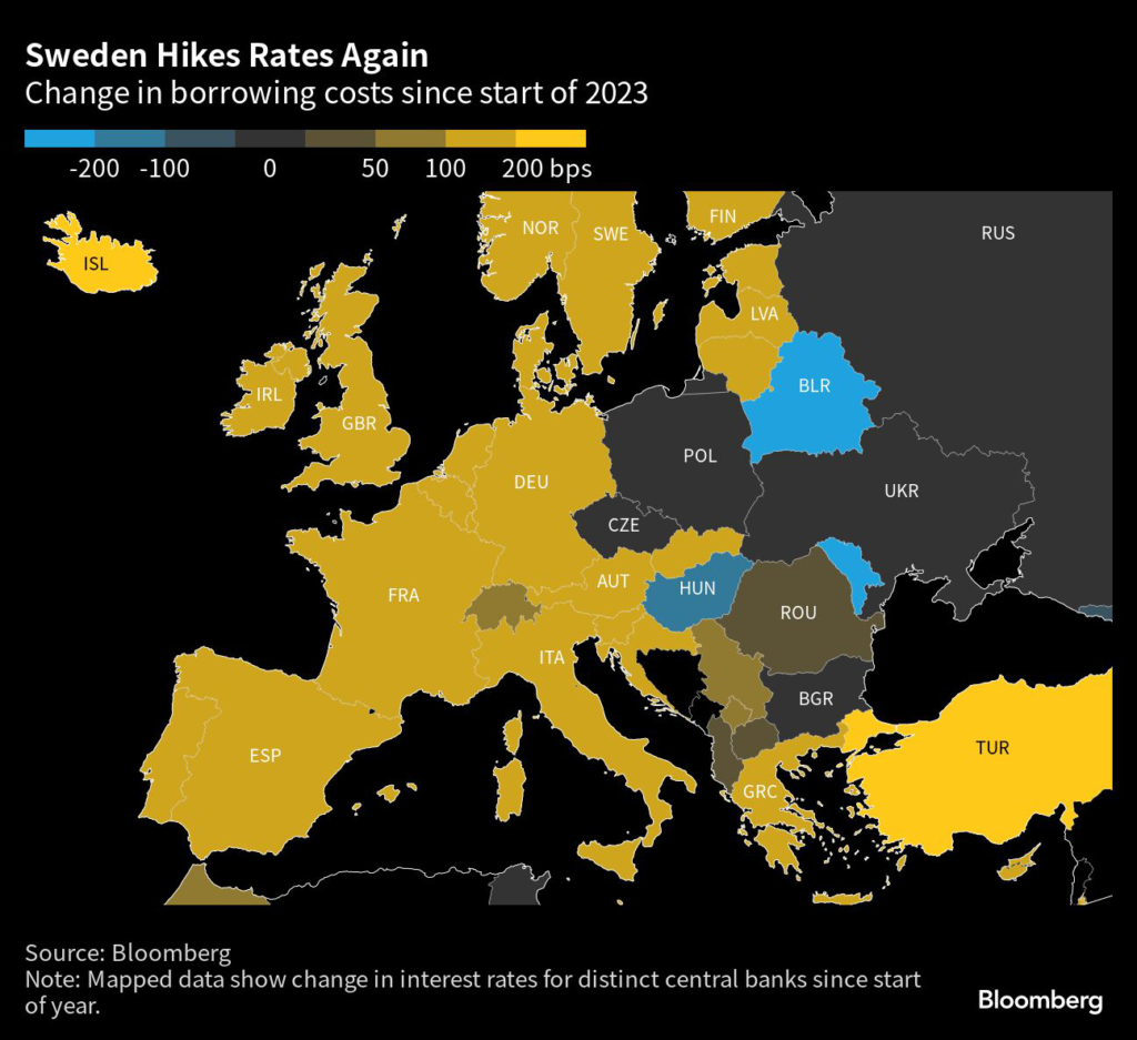 Sweden’s Riksbank raised borrowing costs and pledged accelerated bond sales, a response to stubborn inflation and a weak currency that’s seeking to limit fallout on a vulnerable real estate sector.