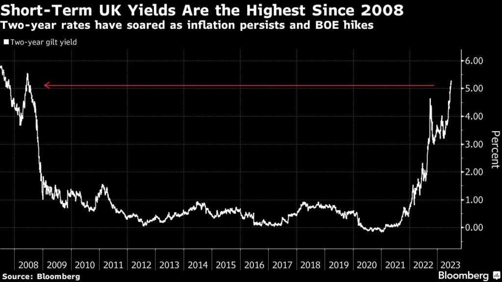 The yield on benchmark two-year bonds rose to as high as 5.33% this week, the highest since 2008.