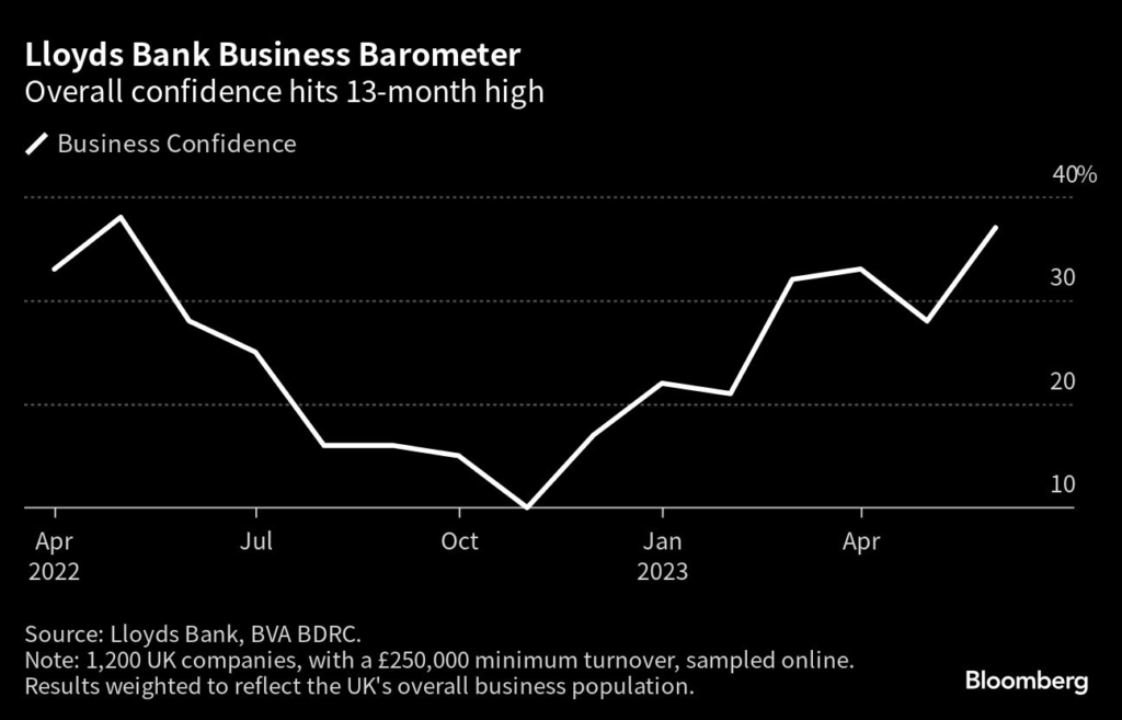 (Bloomberg) — UK business confidence rose to a 13-month high in June as firms shrugged off another Bank of England interest-rate increase, a survey by Lloyds Banking Group Plc found.