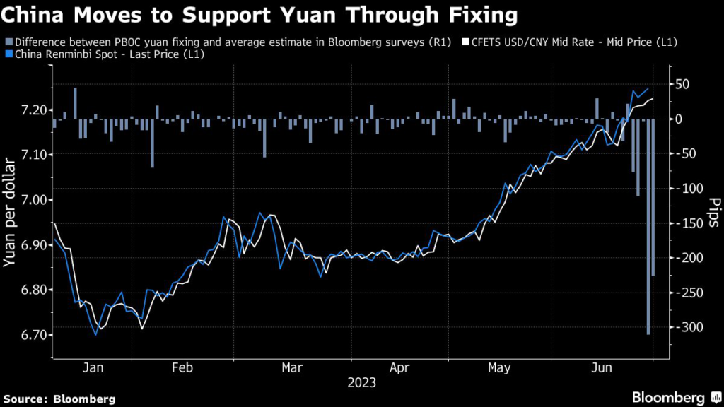 (Bloomberg) — China took steps to slow a decline in the yuan for a fourth time this week, as its weakness intensified on souring sentiment toward the world’s second-largest economy.
