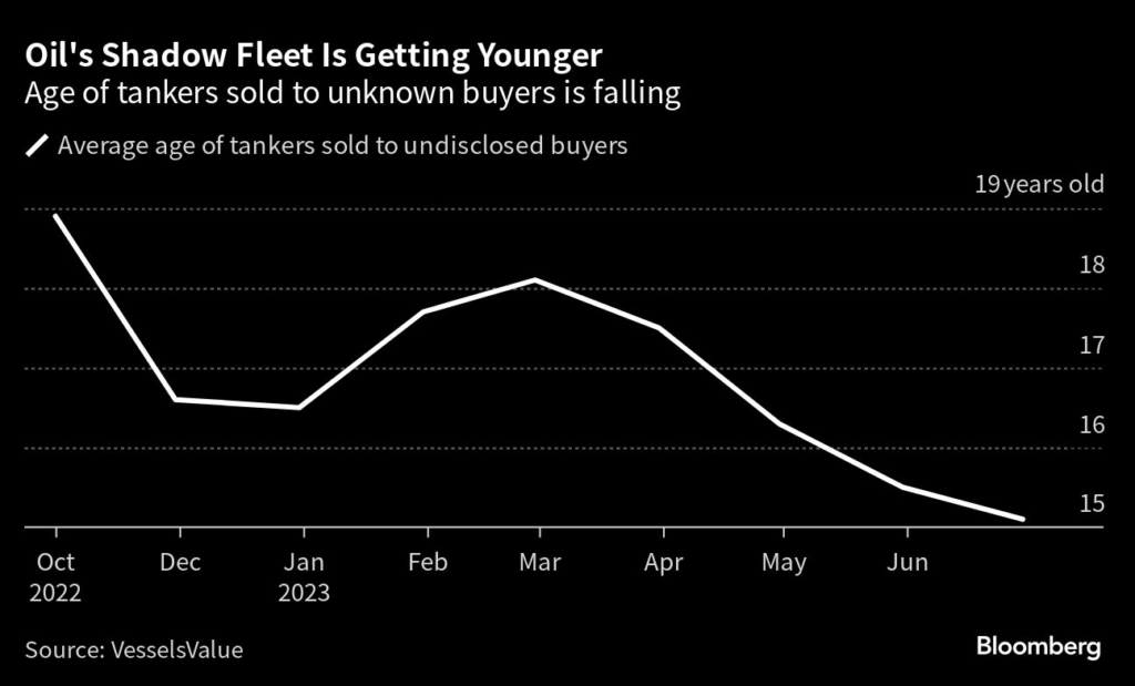 The average age of tankers being sold to undisclosed buyers — one defining characteristic of a ship being part of the dark fleet — fell to 15 years this month, according to VesselsValue.