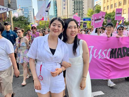 Kim Kyu Jin and Kim Saeyeon, a lesbian couple who married abroad and recently announced a pregnancy, one the first openly LGBT South Korean couples to do so, joined Saturday’s march.