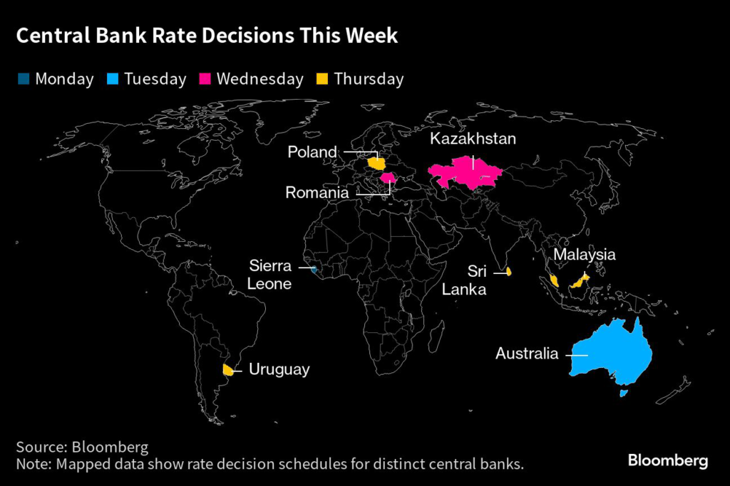 Elsewhere, a possible rate hike in Australia, a measure of China’s economic health, and inflation reports from Switzerland to Turkey to Brazil will keep investors busy.