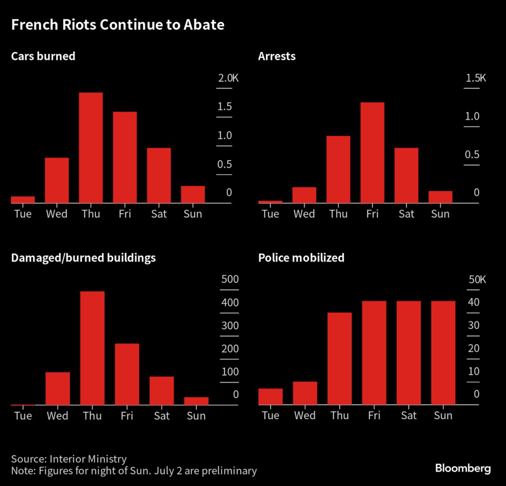 (Bloomberg) — French authorities will maintain a massive police deployment overnight in an effort to ensure a continued drop in the unrest that has hit the country for the past week.