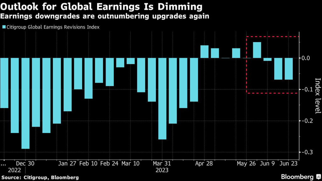 But there are mounting signs the gains can’t last. A Citigroup Inc. index shows downgrades to profit estimates are outnumbering upgrades again, while analysts are projecting a sharper decline in earnings for the full year, according to data compiled by Bloomberg Intelligence.